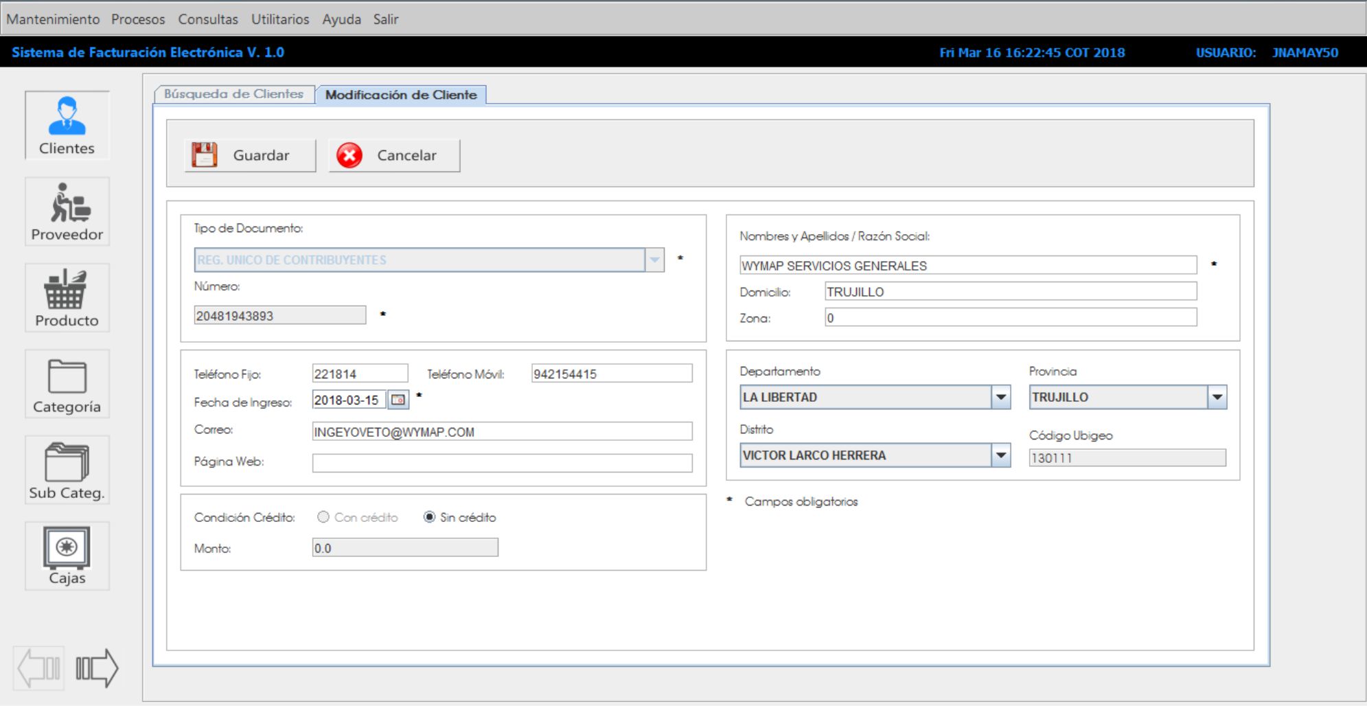 Este módulo nos permite realizar el ingreso de nuevos clientes y la localización de clientes utilizando el buscador inteligente. Aquí podemos colocar el monto de crédito asignado al cliente siempre y cuando la empresa en configuración haya activado la opción de crédito. En casos puntuales se puede asignar líneas de crédito por montos mayores al establecido en la configuración general del negocio (siempre y cuando sea autorizado por la jefatura competente), adicionalmente también podemos suspender líneas de crédito.